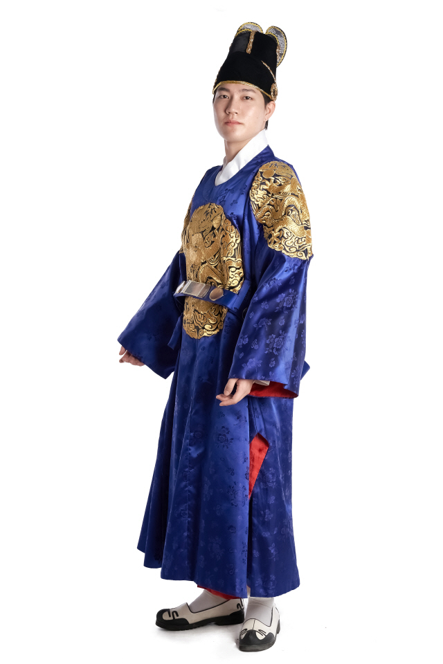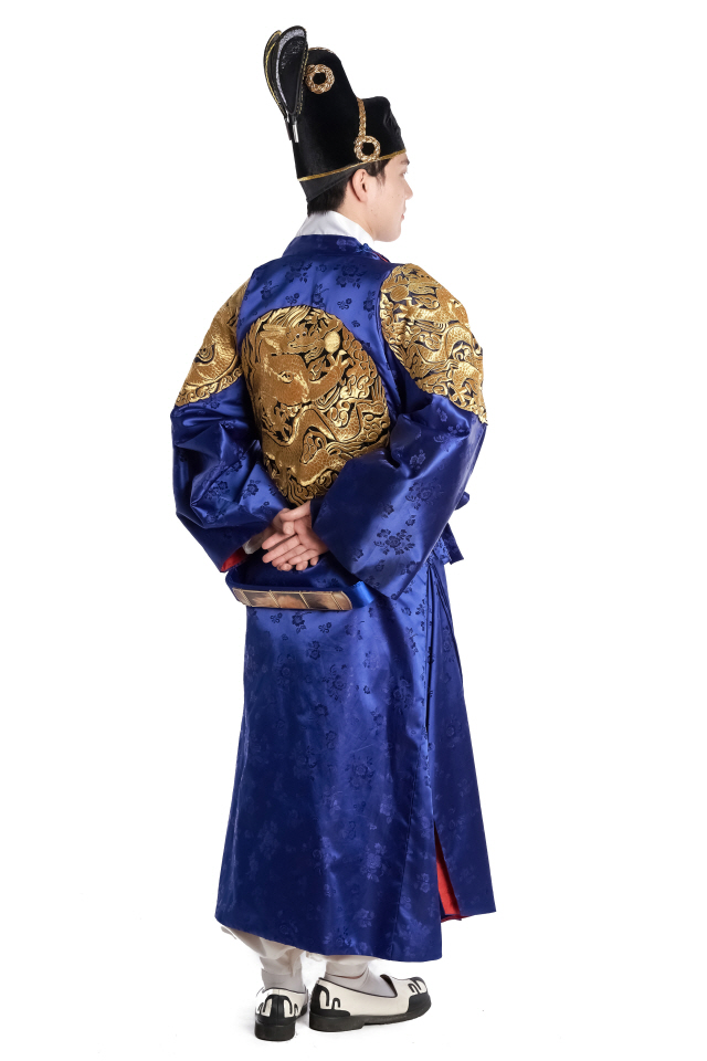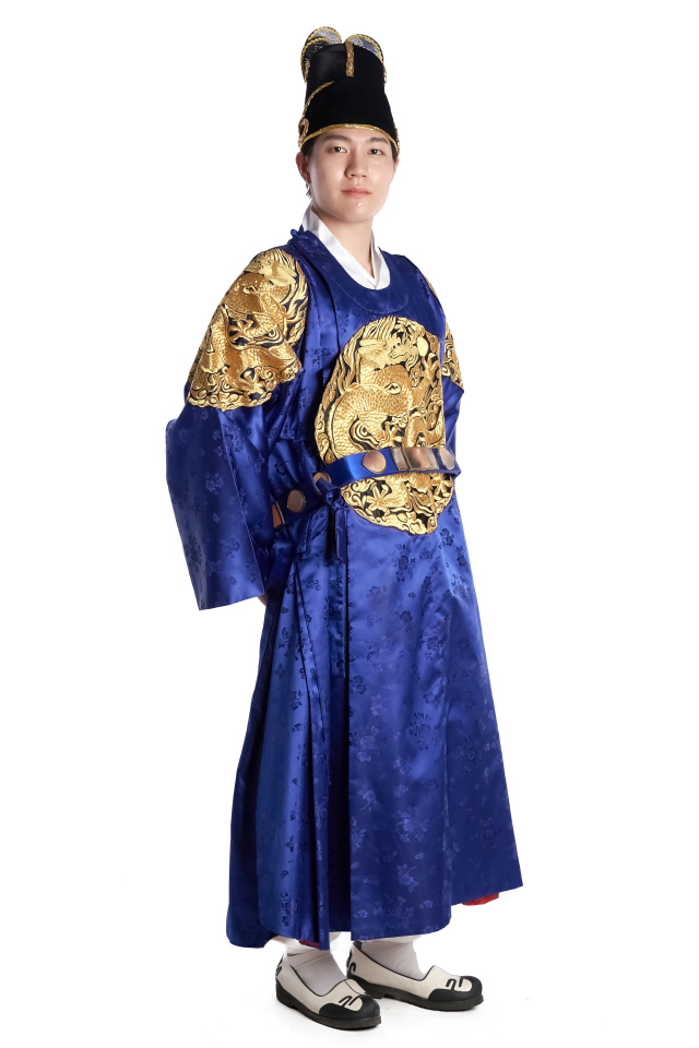 • 용포, 각대(허리띠), 흰바지(속한복), 익선관(모자)